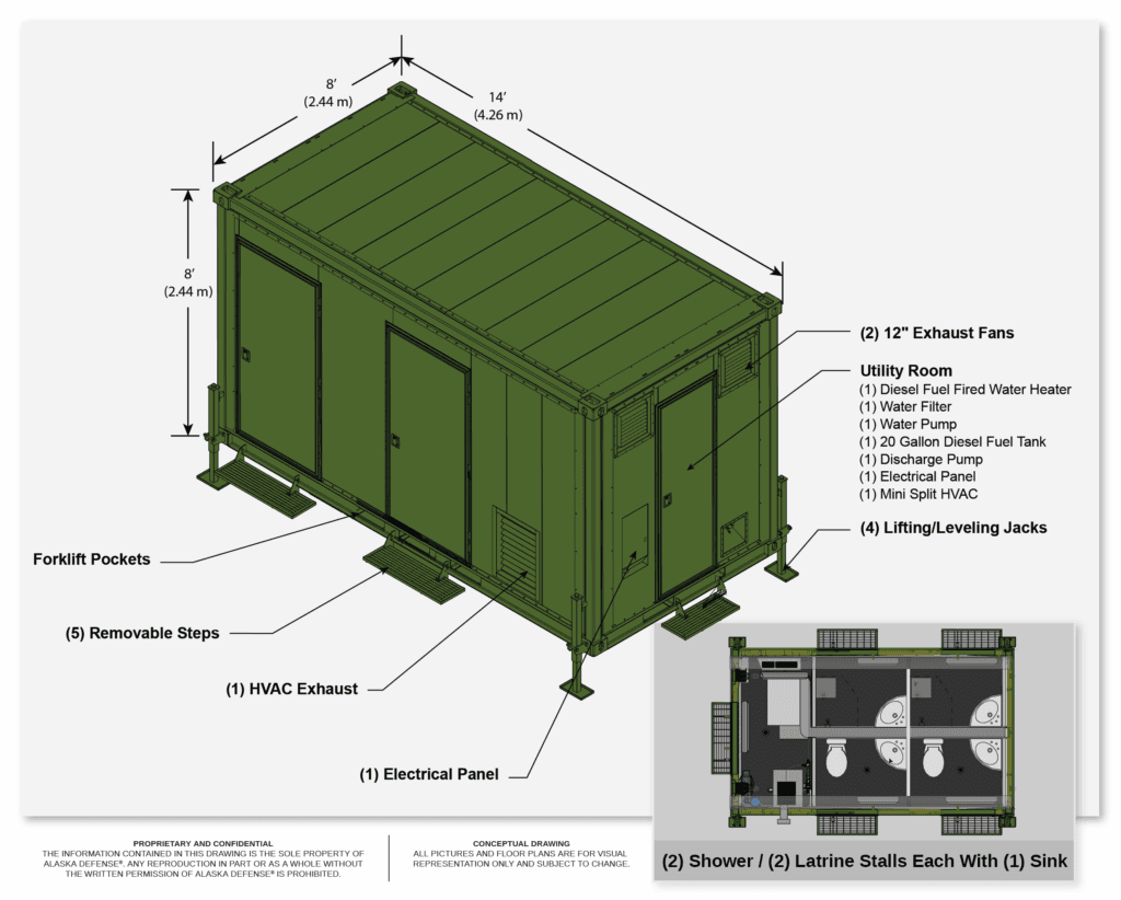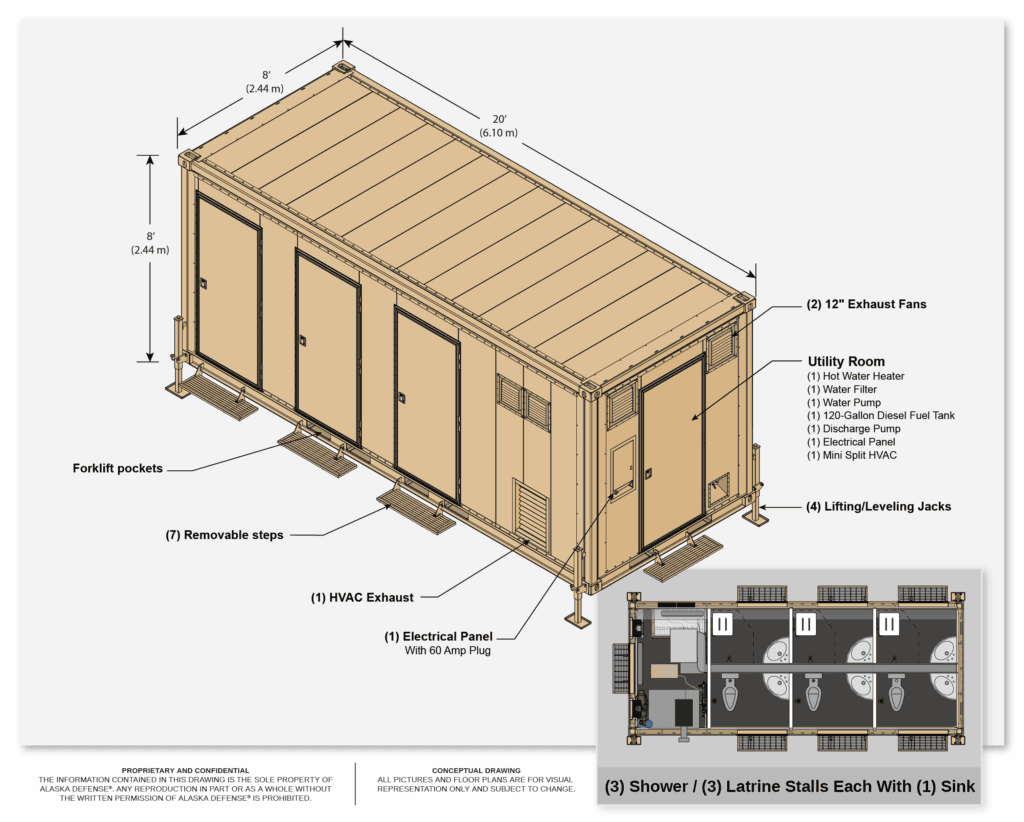 Containerized combo hygiene facilities from Alaska Defense® are built to military specifications, ensuring durability and operational efficiency: