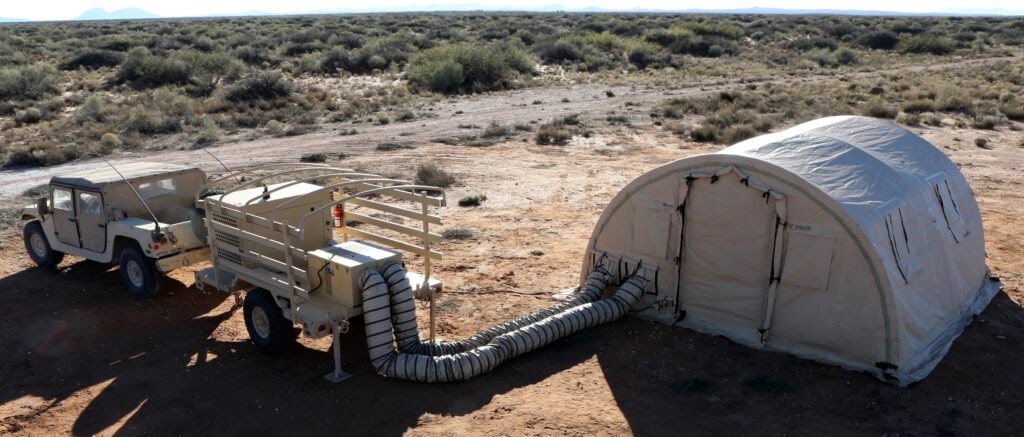 An AKXTERRA® trailer equipped with a trailer-mounted 2.5-ton Alaska ECU® and 15 kW diesel generator, delivering power and environmental control to an Alaska XP® Shelter System in a remote deployment environment.
